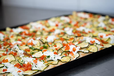 Feine Zucchini-Scheiben und frische Tomatenwürfel, abgerundet mit cremiger Burrata, Schnittlauch, Petersilie und einem Hauch Olivenöl – leicht, edel und sommerlich frisch!